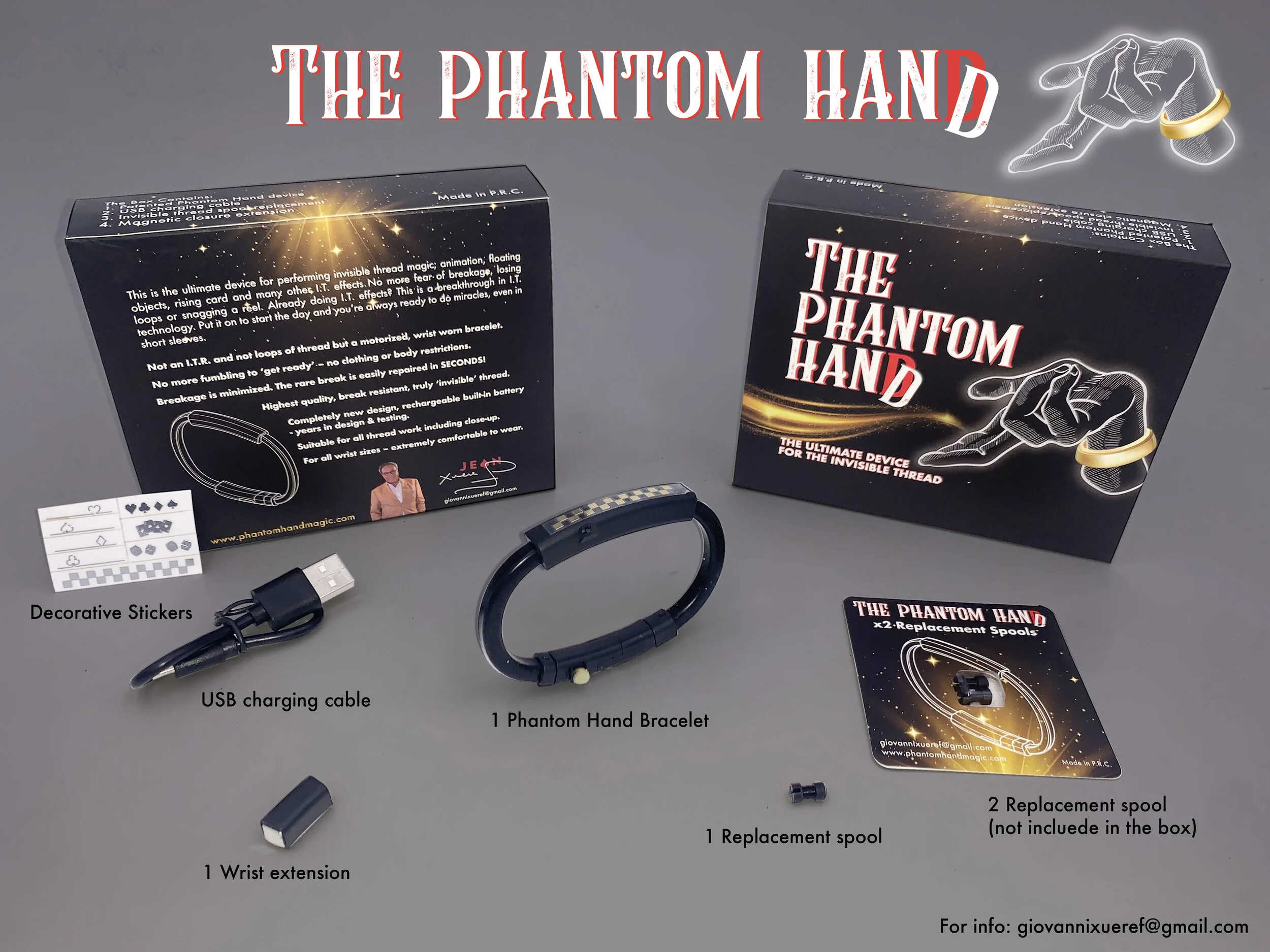 This is the ultimate device for Invisible Thread close up work. After years of engineering and trial and error, we finally invented the best gimmick to make the invisible thread an invention for amateurs. We all know how easy it is to break the thread. With this new mechanism it will be close to impossible to break it and extremely simple to use it. If it does break, you will be able to replace the spool in under a minute. With three simple moves you will see miracles in the making. You can use it any time and anywhere with no preparation whatsoever. With a t-shirt or swimwear, moving things is now possible with The Phantom Hand. It is perfect for beginners and for close up work.